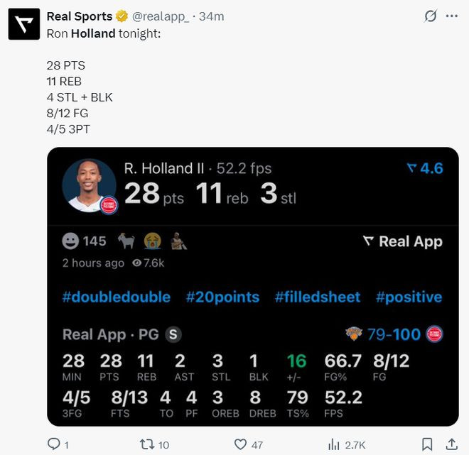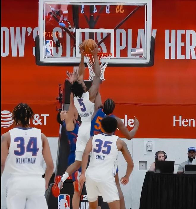 这场比赛活塞多位核心球员都到场观战——坎宁安、杜伦、奥萨尔、哈里斯等,裸足只有1.995米的霍兰德有一个后发制人的补扣,他在尼克斯两人的包夹下补扣成功,他等于是直接隔扣了两人,这个身体天赋真的很炸裂。