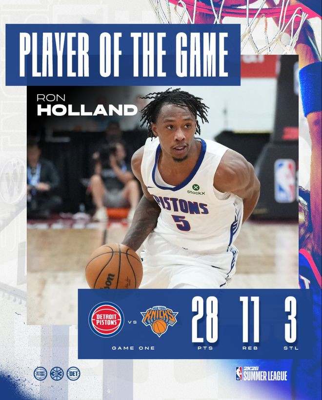 活塞官方也晒出了霍兰德此役的数据为他点赞,霍兰德在24-25赛季已经进入了活塞轮换,打了81场常规赛场均15.7分钟,拿到6.4分2.7篮板1助攻0.6抢断0.21盖帽,命中率47.4%,三分命中率23.8%,他最弱一环是投射,可这场夏联他让人们看到投射方面巨大的进步。